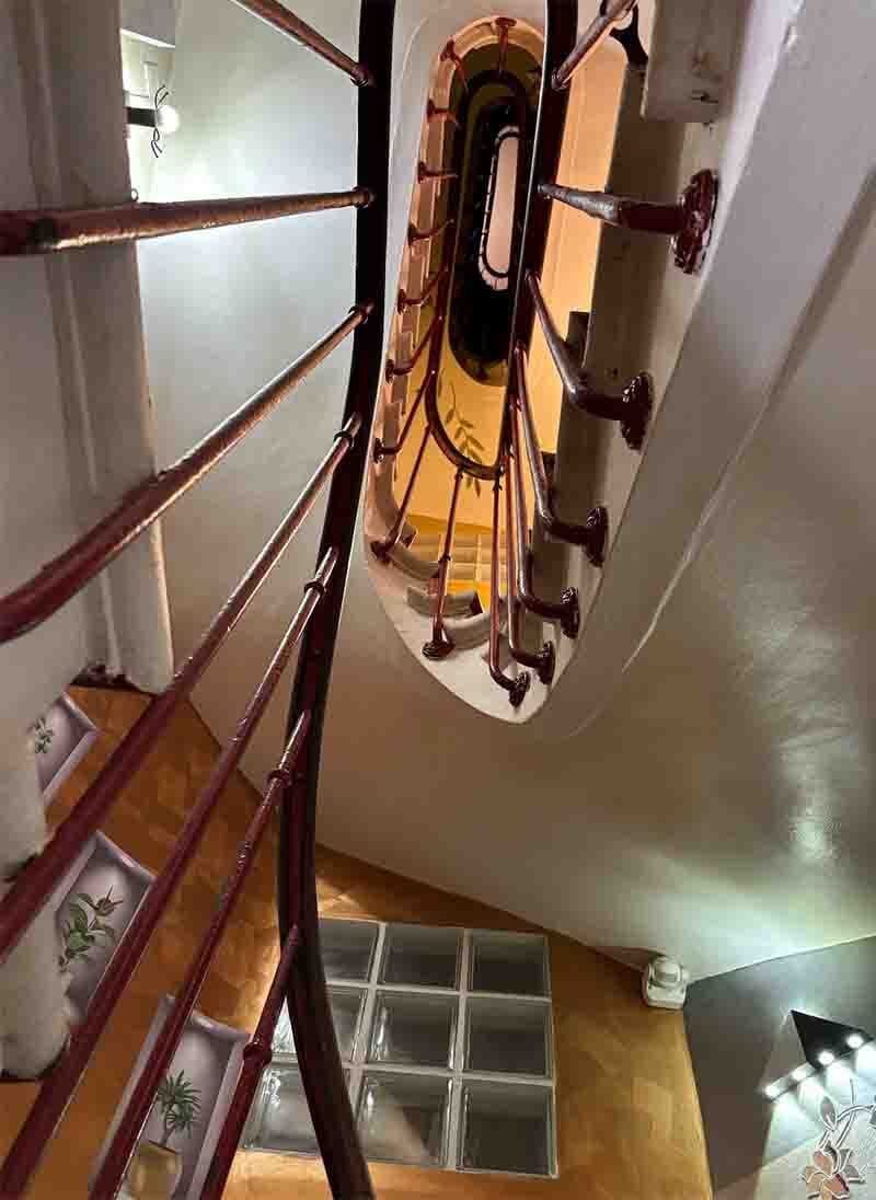 I don’t mind stairs, so I didn’t ask for any particular floor ahead of time. When I arrived, I was given a room on the top floor — four flights up. And then I saw the staircase.